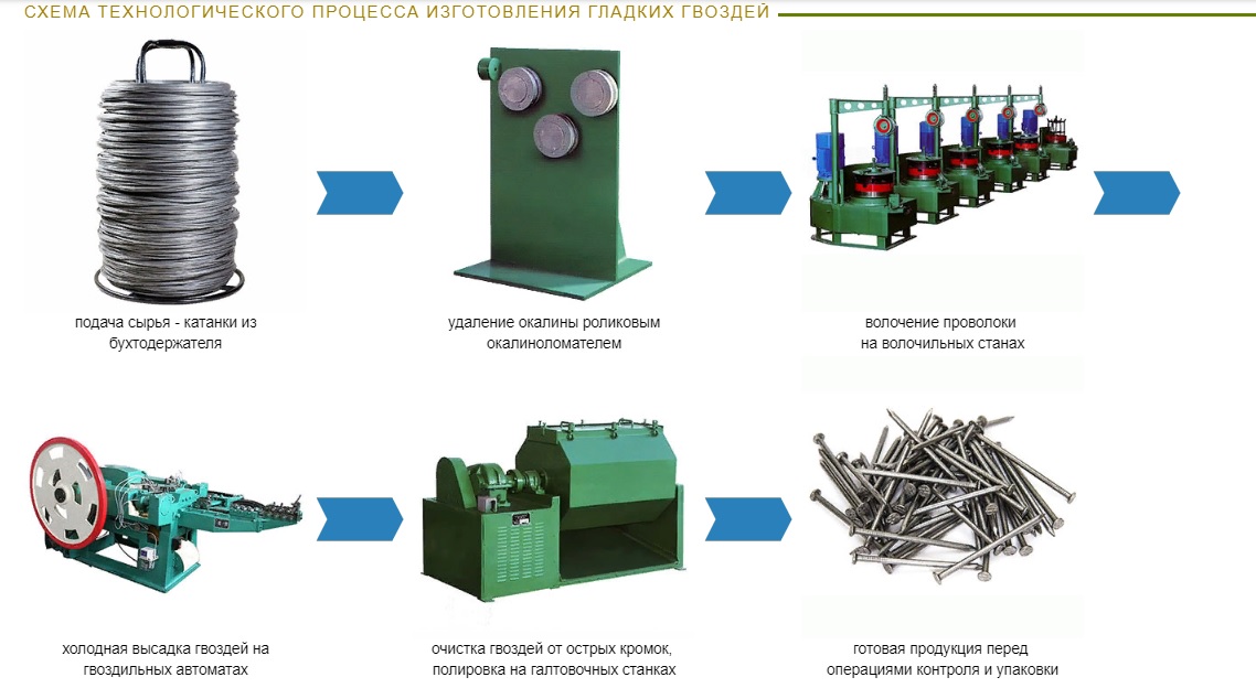 С бухты проволоку направляют в выпрямляющее устройство. Далее проволока поступает в подающий механизм, с помощью которого регулируют длину гвоздя и подают проволоку в рабочую зону.